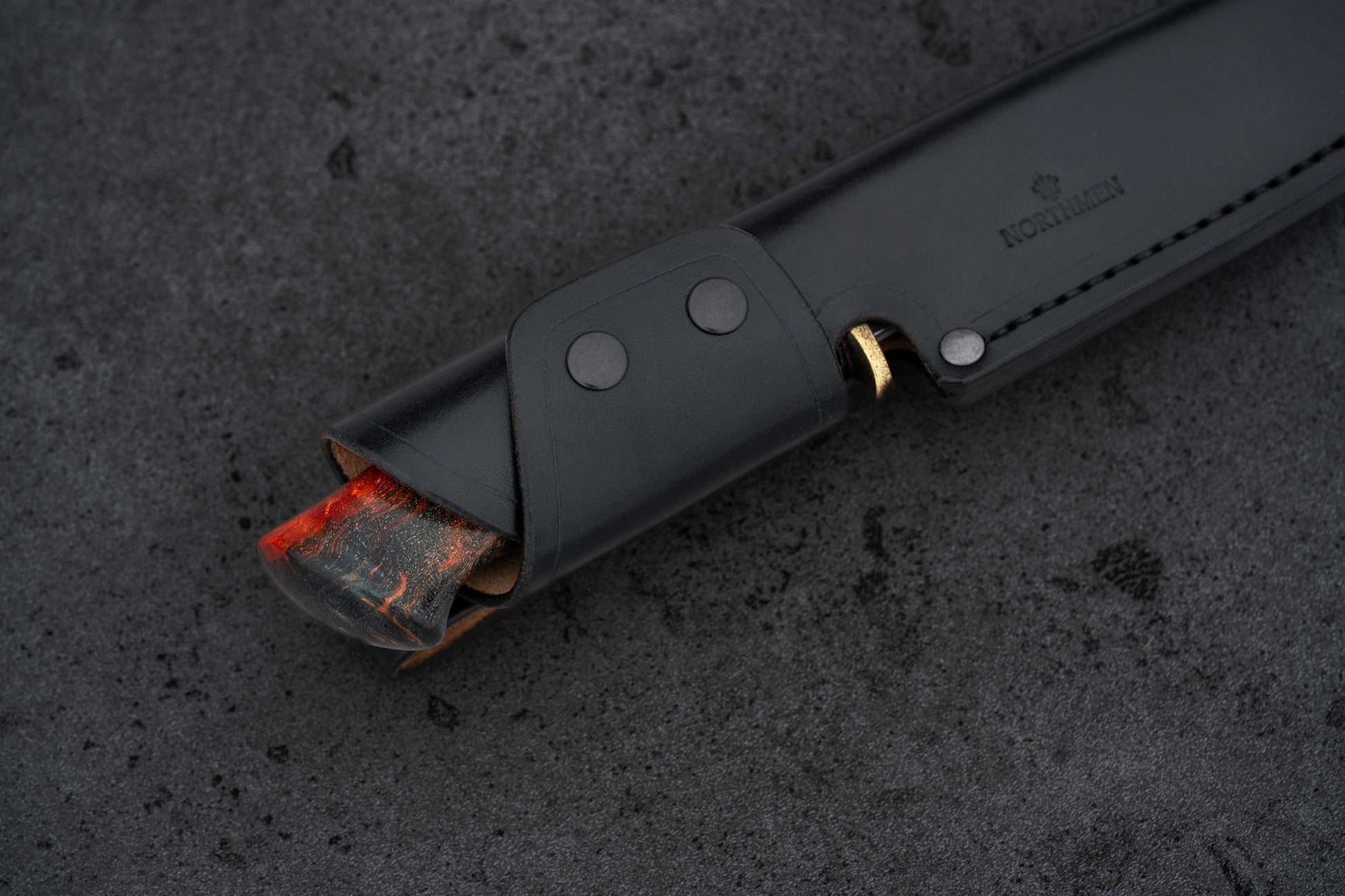 Black leather sheath included. Gunmetal rivets, black thread, hand-stitched.