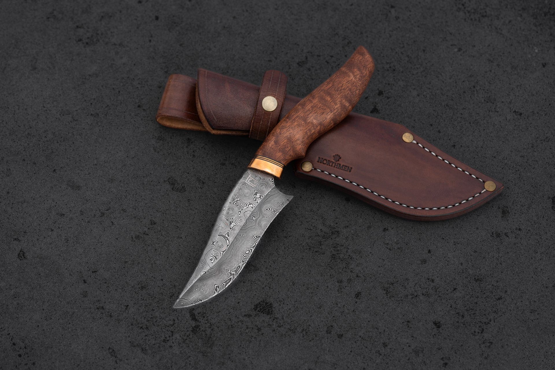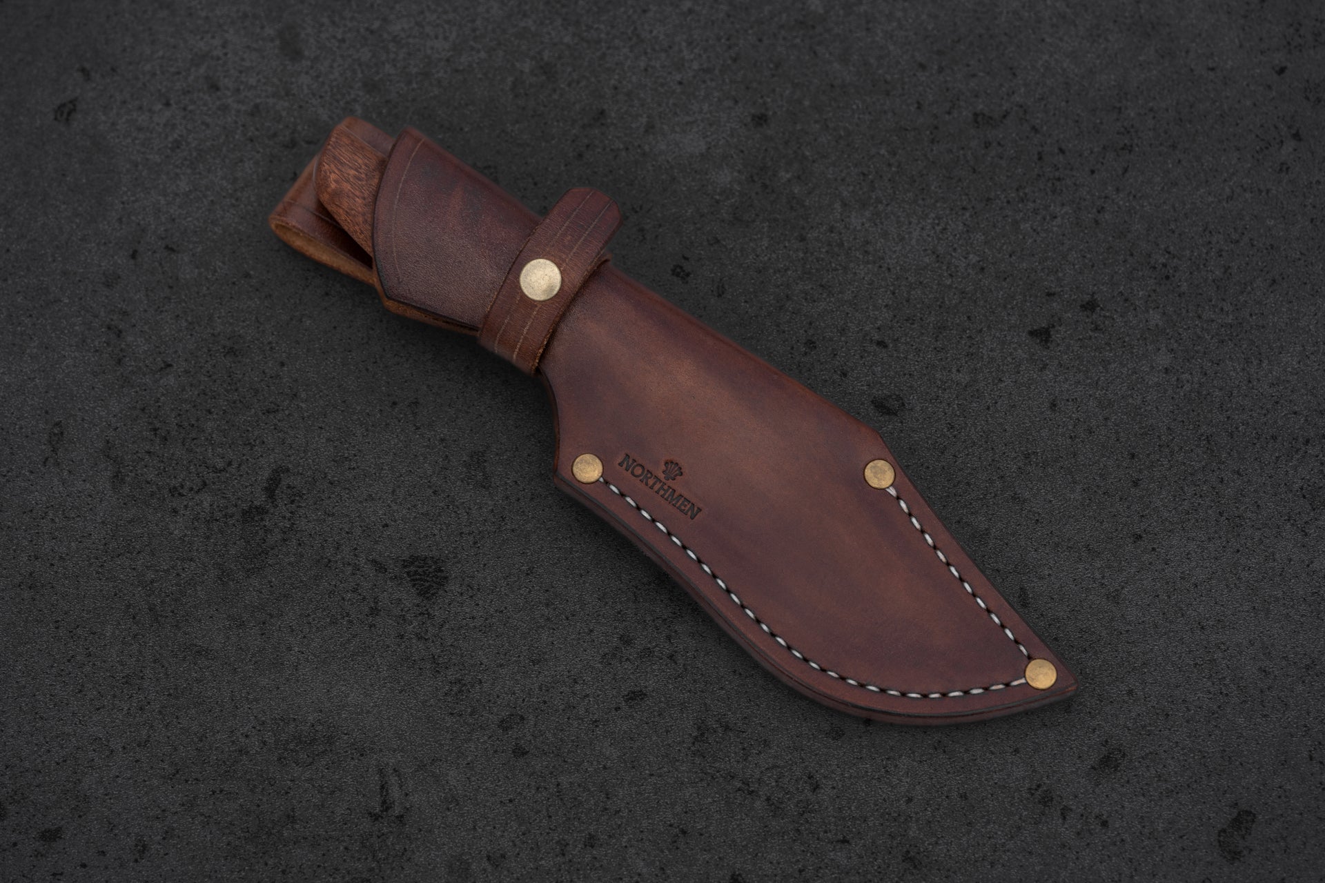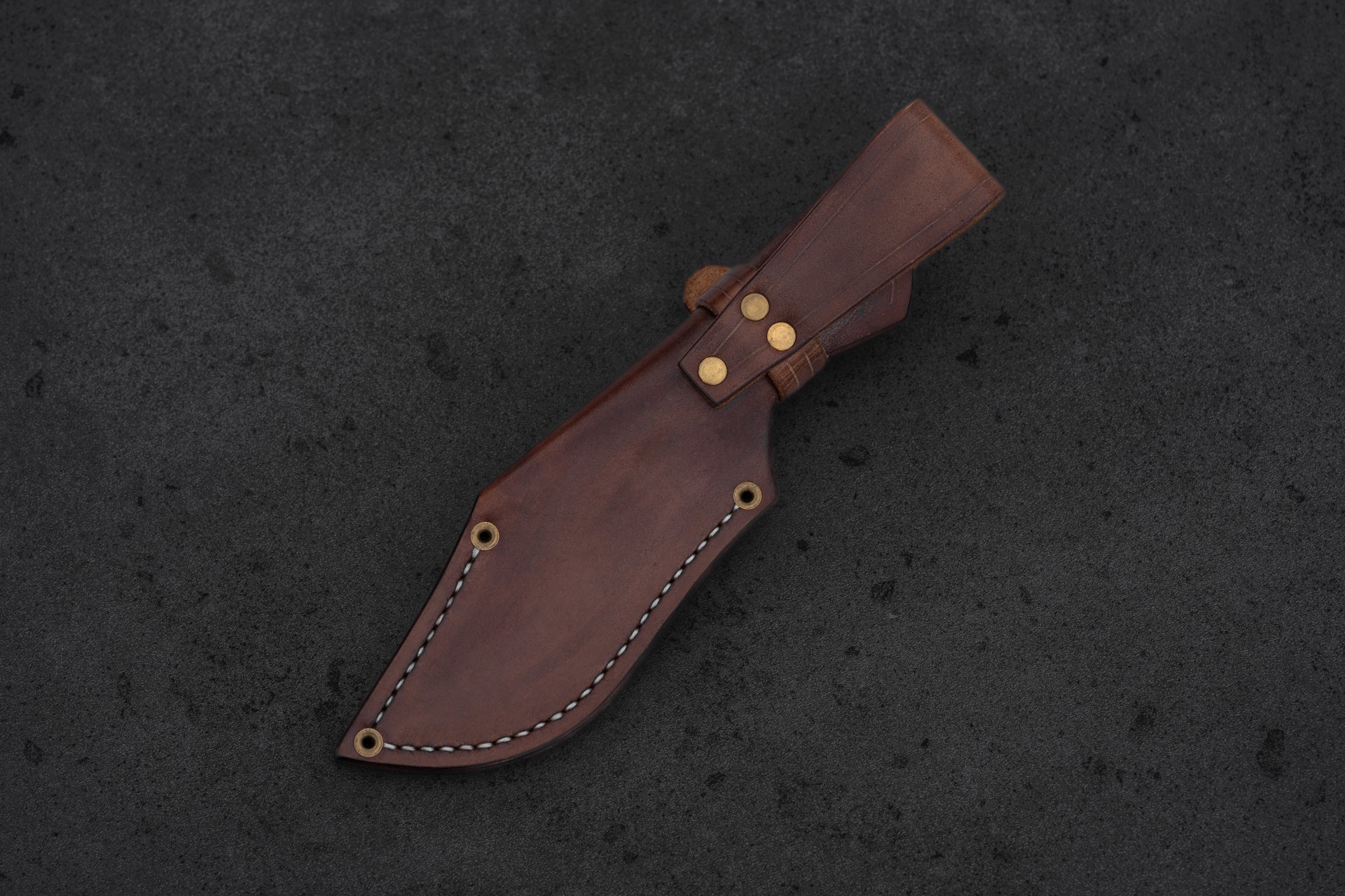 Walnut brown leather sheath included. Brass rivets, white thread, hand-stitched.
