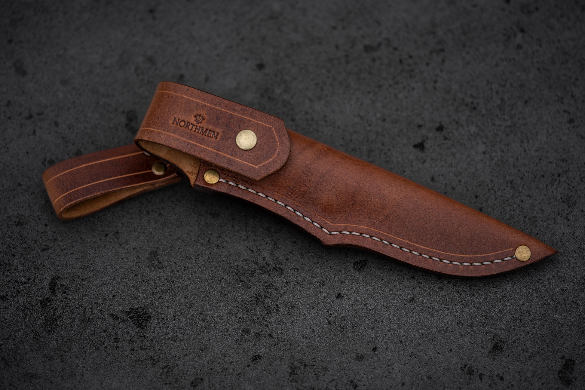 Brown leather sheath included. Brass rivets, white thread, hand-stitched.