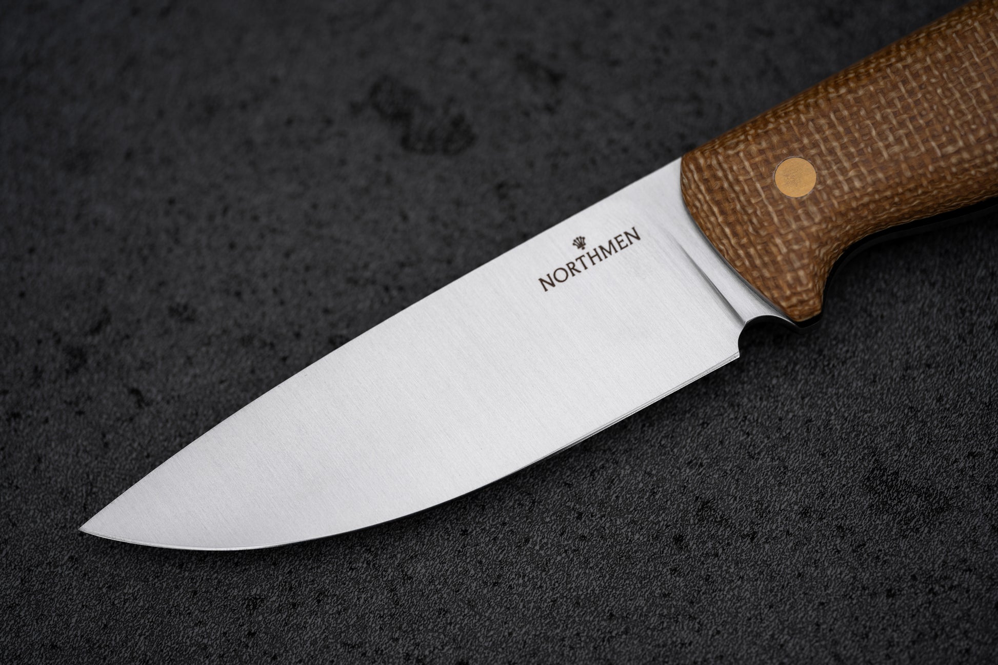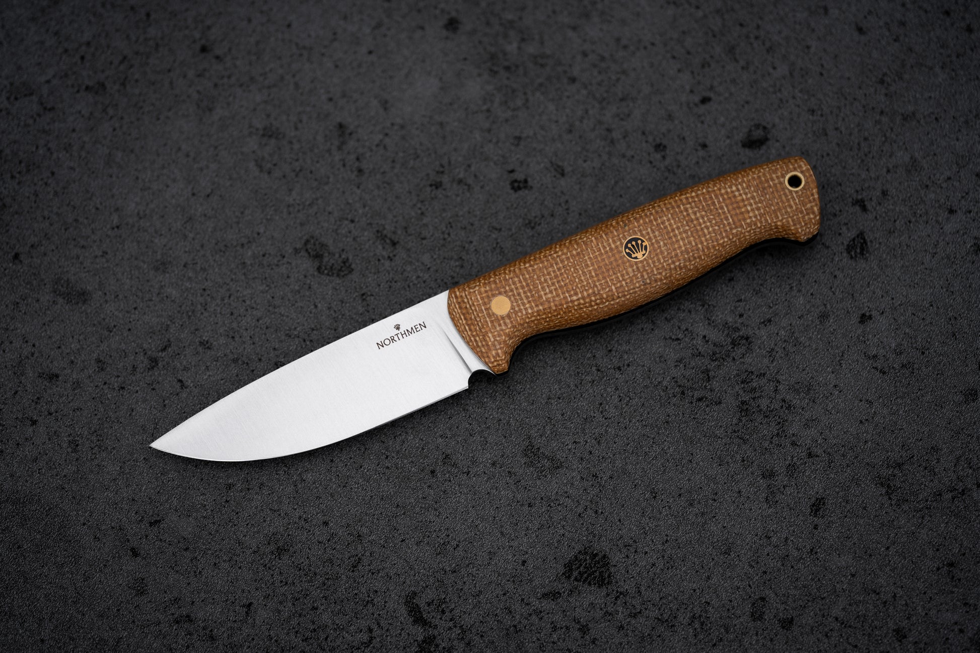 Jute Micarta handle. Brass corby bolts and custom Northmen Crown brass mosaic pin. Brass lanyard hole.