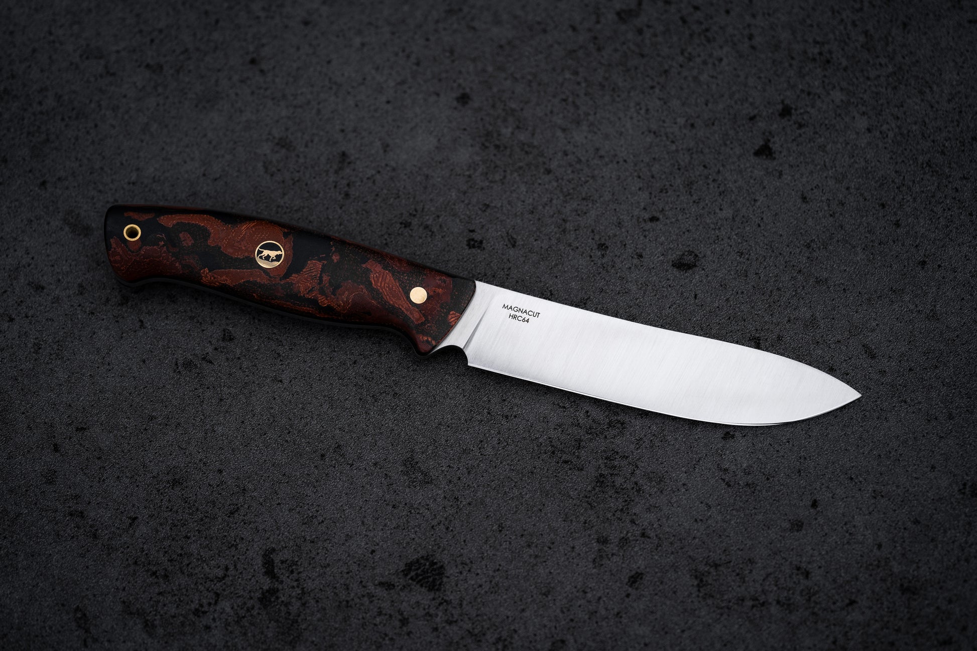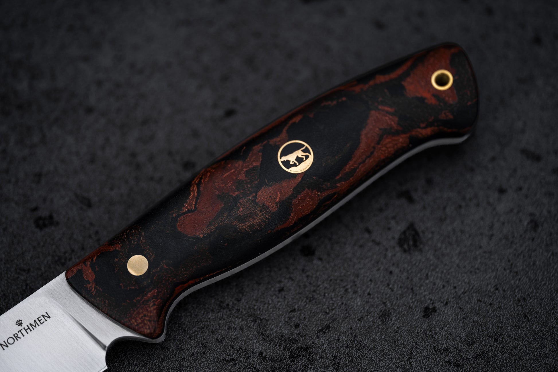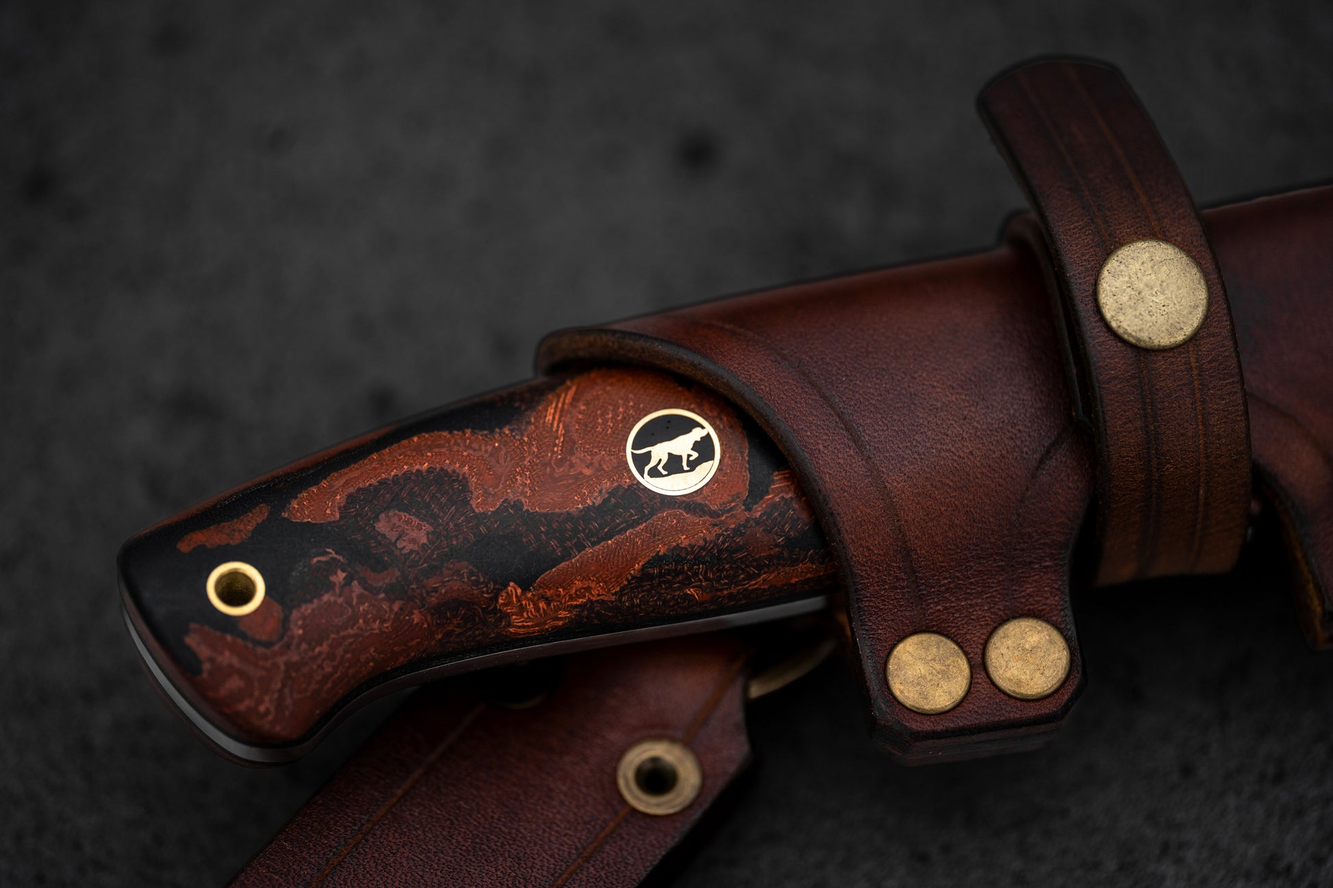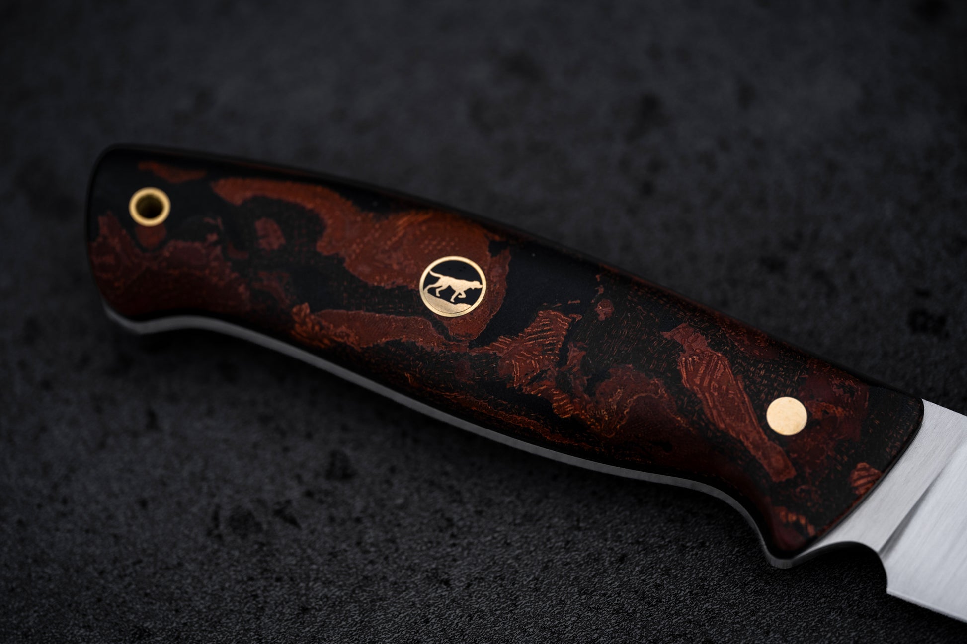Terracota Burl Micarta handle. Brass corby bolts and custom hunting dog mosaic pin. Brass lanyard hole.