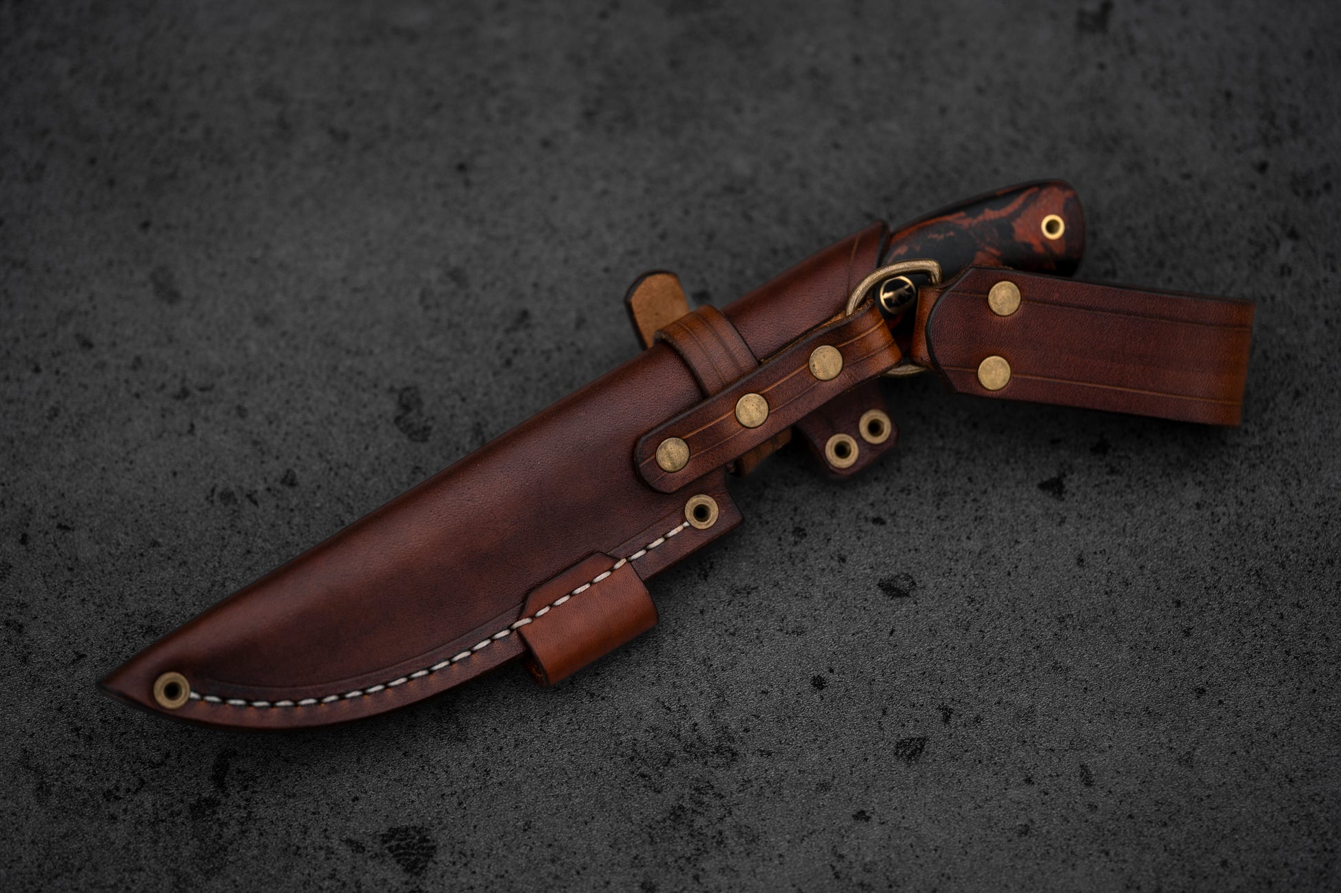 Brown leather sheath included. Brass rivets, white thread, hand-stitched.
